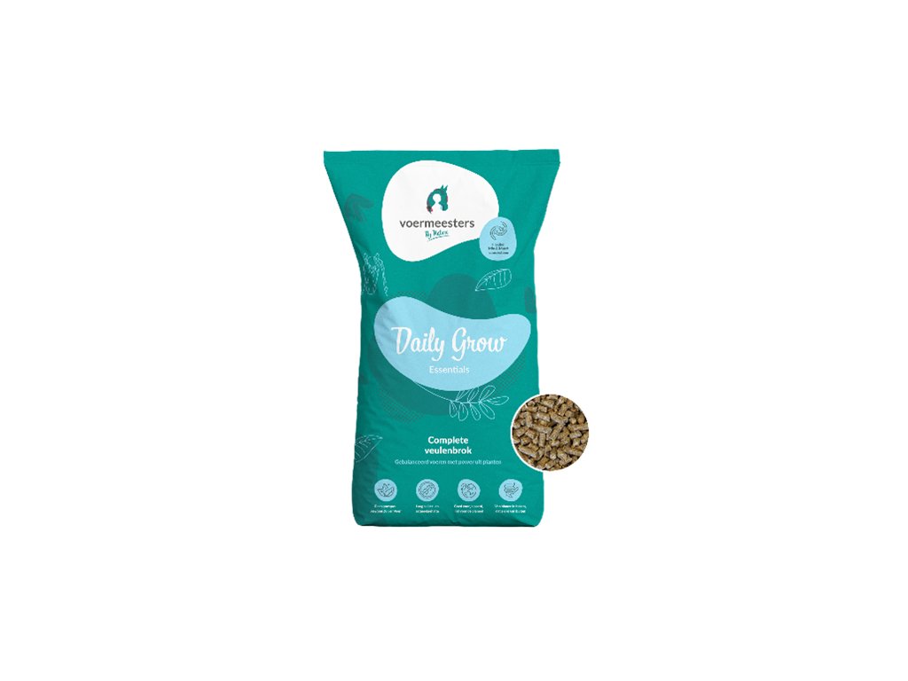 Voermeesters Daily Grow jsou strukturou bohaté granule pro každodenní krmení, které podporují vývoj svalů a tvorbu kostí u hříbat během jejich prvního roku života. Díky vysokému obsahu vlákniny respektují přirozené potřeby mladých koní. Krmivo je plně vyvážené vůči energetické hodnotě objemného krmiva a poskytuje kompletní, vědecky podloženou podporu růstu hříbat se současně pozitivním vlivem na imunitní systém. Voermeesters Daily Grow nejsou jen zdrojem živin – představují odpovědný přístup k podpoře další generace z hlediska zdraví, kvality a poctivosti.